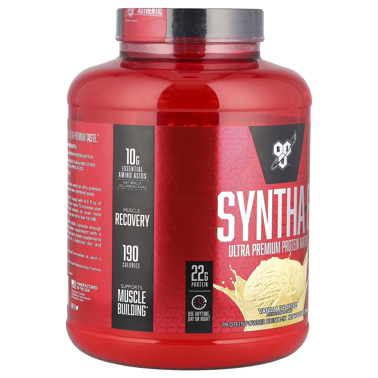 Особливість Syntha-6 полягає у його багатокомпонентній білковій матриці. В одній порції (47 г) ви отримуєте 22 г білка, який надходить із шести різних джерел, включаючи ізолят і концентрат сироваткового протеїну, кальцієвий казеїнат, мiцелярний казеїн, ізолят молочного білка та яєчний альбумін. Така комбінація забезпечує миттєвий, середньо- та довготривалий вплив, насичуючи організм амінокислотами впродовж кількох годин.