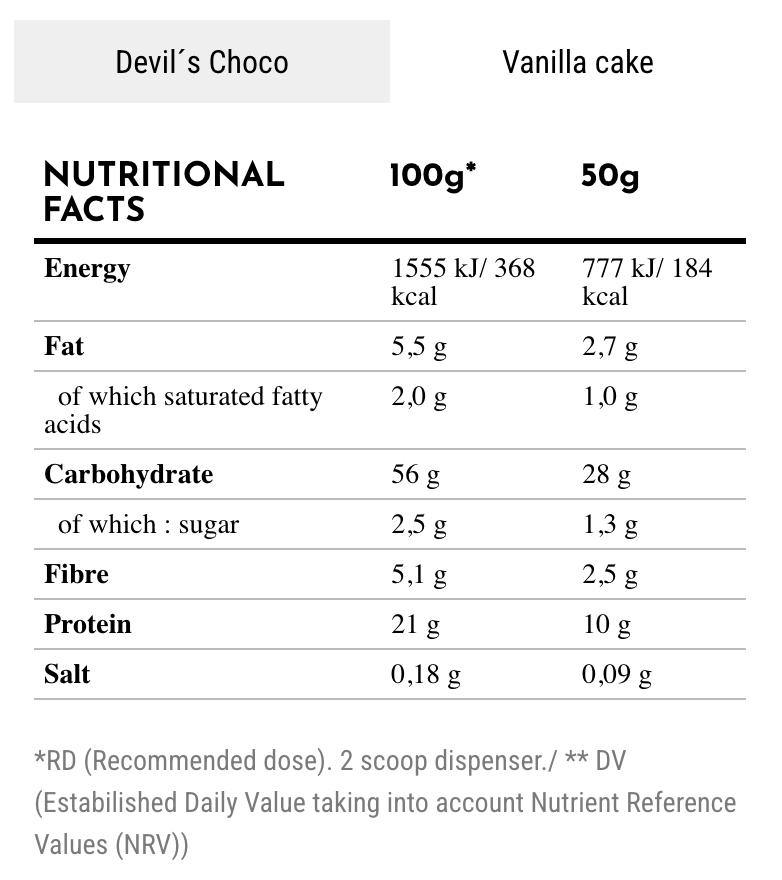 Поживна цінність на порцію 100 г залежить від смаку Devil´s Choco/ Vanilla Cake: