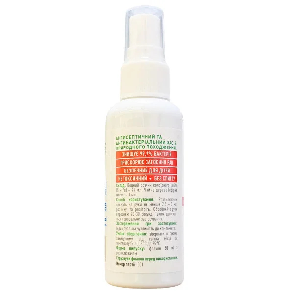 Флакон об’ємом 60 мл оснащений зручним розпилювачем, який дозволяє економно наносити 2,5–3 мл розчину на одну обробку.
