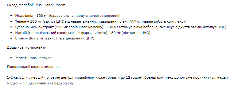 Застосування: Рекомендується приймати по 1 капсулі Stark Pharm Modafinil Plus на день, переважно вранці. Для досягнення максимального ефекту рекомендується приймати курс протягом кількох тижнів.