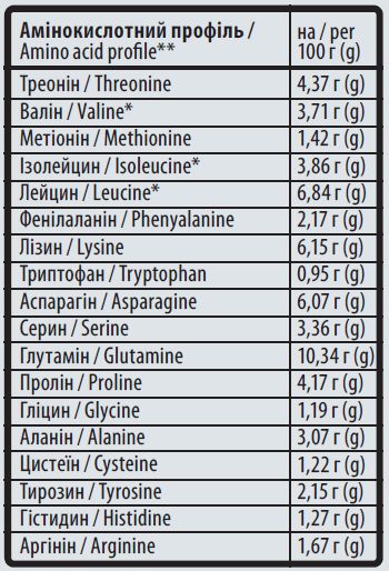 Окрім цього, продукт містить глутамін, який сприяє відновленню енергетичних запасів, підтримує імунну систему й зменшує втому. Висока концентрація лізину допомагає засвоювати кальцій, а метіонін бере участь у процесах детоксикації організму.