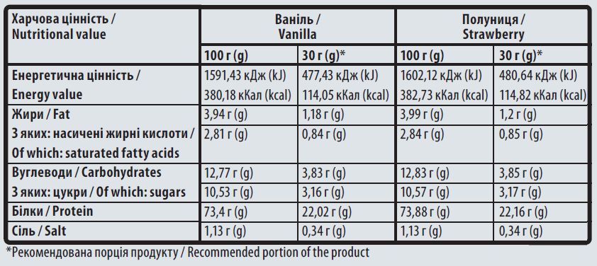 Кожна порція продукту (30 г) містить близько 22 г чистого білка, що є оптимальною кількістю для стимуляції м’язового синтезу. У складі також міститься глутамін і природні пептиди, які пришвидшують регенерацію тканин і допомагають відновити енергетичний баланс після фізичних навантажень.