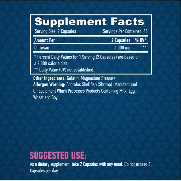 Хітозан відомий своєю здатністю взаємодіяти з жирами у травному тракті, тому його часто включають у програми харчування, спрямовані на контроль раціону та харчових звичок. У складі Haya Labs використовується чистий хітозан у зручному капсульному форматі. Одна порція становить 2 капсули, які містять 1000 мг хітозану. В одній капсулі — 500 мг активної речовини. Упаковка містить 90 капсул, чого достатньо для курсового застосування.