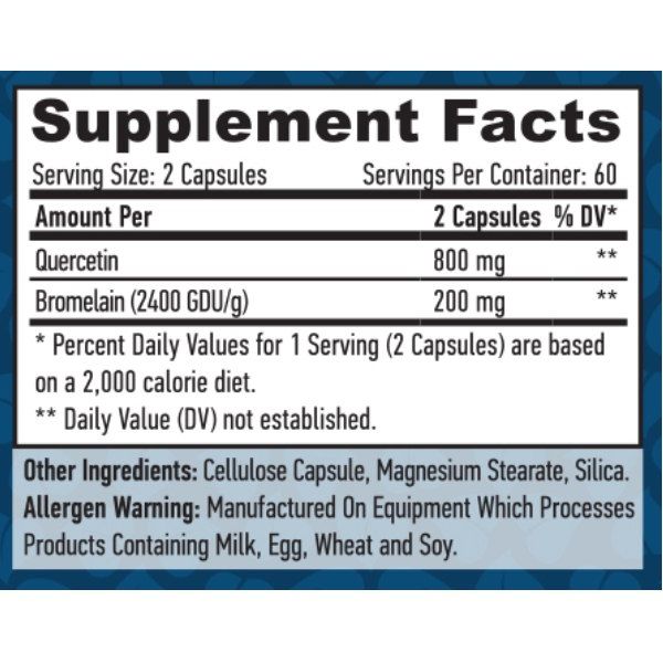 Кверцетин — це рослинний флавоноїд, який міститься в багатьох фруктах і овочах та відомий своїми антиоксидантними властивостями. Він бере участь у захисті клітин від дії вільних радикалів і підтримує нормальне функціонування імунної системи. Бромелайн — це природний фермент ананаса, який сприяє кращому засвоєнню кверцетину та підсилює його ефективність.