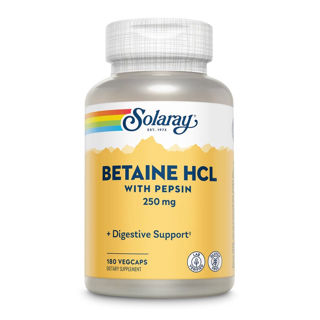 Solaray Betaine HCL with Pepsin 250 mg — це продумана харчова добавка, яка допомагає підтримувати природні процеси травлення та відчуття легкості після їжі. Формула створена з урахуванням сучасних потреб людини, яка веде активний спосіб життя та прагне гармонійного балансу у своєму раціоні.