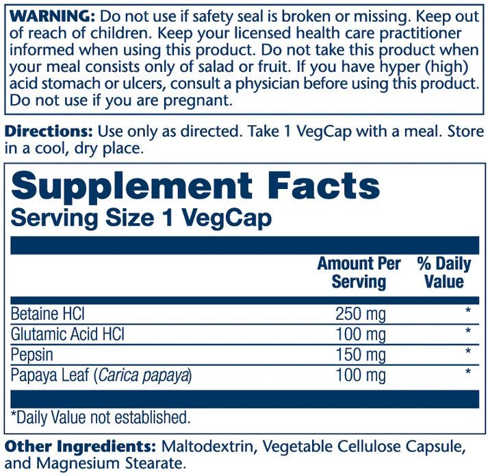 Завдяки поєднанню бетаїну гідрохлориду та пепсину продукт органічно доповнює щоденне харчування. Ці компоненти беруть участь у природних процесах перетравлення їжі, особливо білкових продуктів. У складі також присутня глутамінова кислота та екстракт листя папаї — рослинний компонент, який традиційно використовується у продуктах для підтримки комфортного травлення.