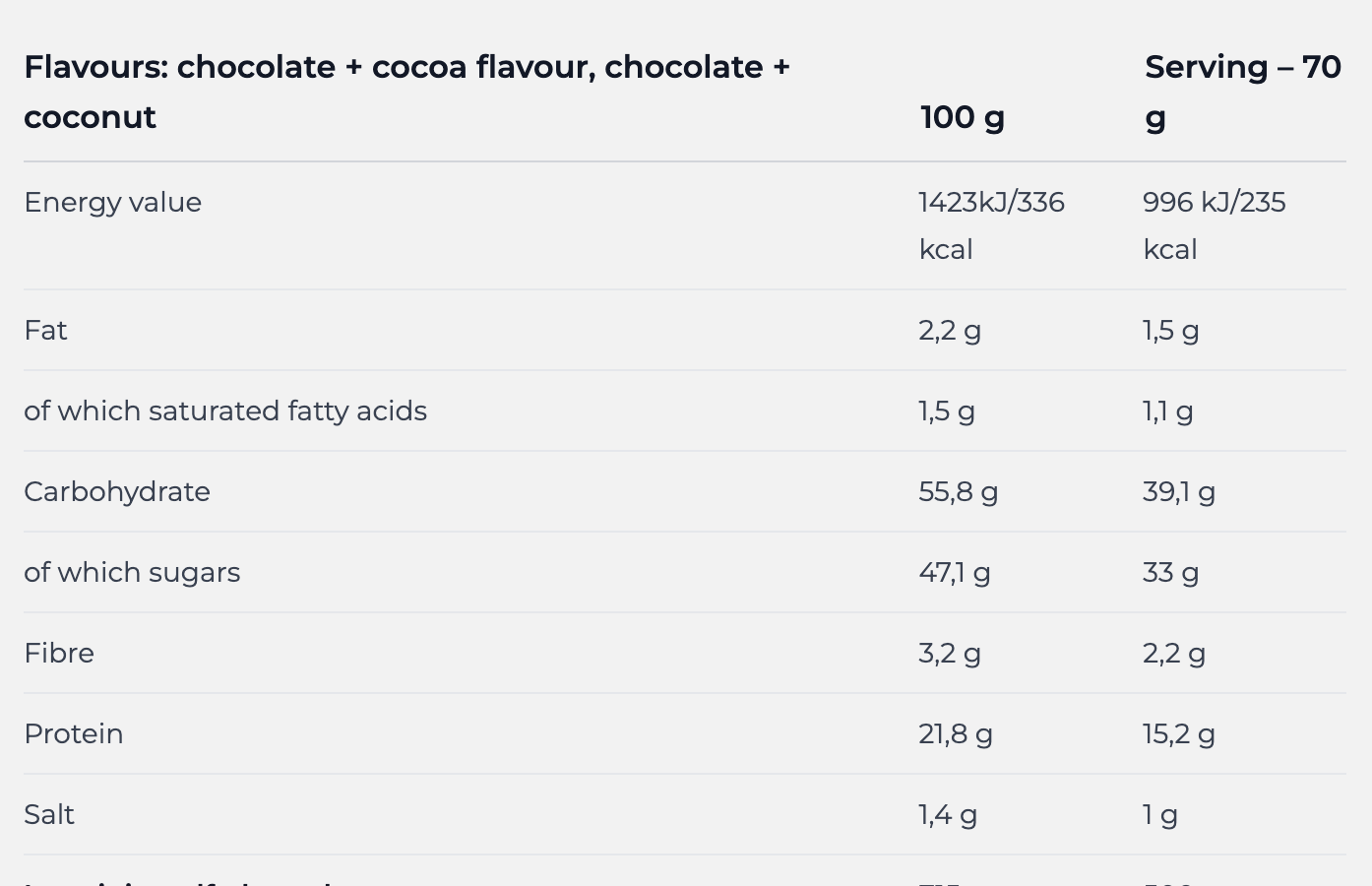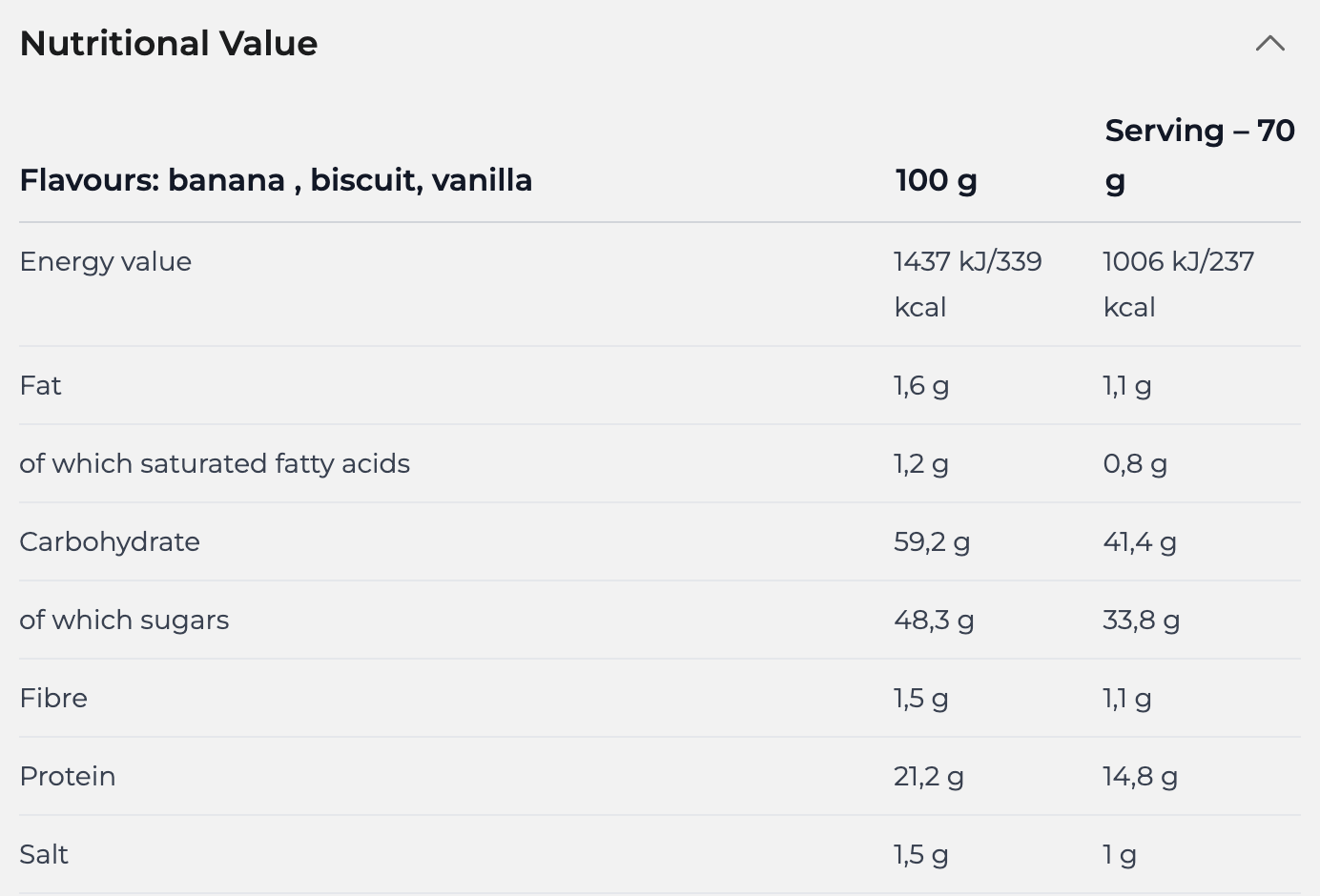 Поживна цінність Nutrend Mass Gain 2100 г на порцію 70 г залежить від смаку banana, biscuit, vanilla / chocolate + cocoa flavour, chocolate + coconut:-