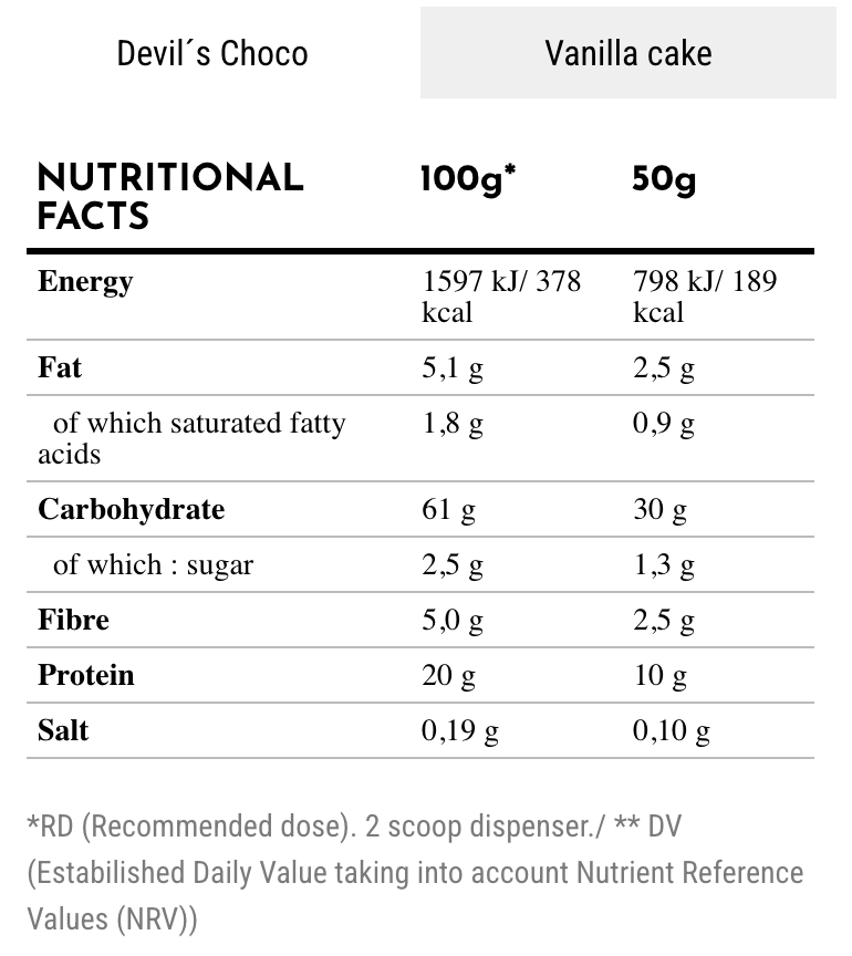 Поживна цінність на порцію 100 г залежить від смаку Devil´s Choco/ Vanilla Cake: