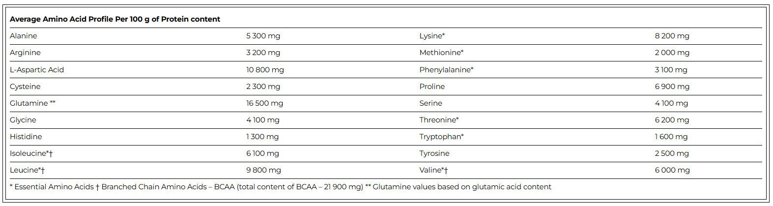 Амінокислотний профіль на 100 г білка включає високі дози BCAA (лейцин, ізолейцин, валін), значний вміст глютаміну, лізин, треонін, гістидин, фенілаланін, метіонін, пролін та інші важливі амінокислоти. Це робить AMIX Fusion одним з найефективніших рішень для відновлення, росту і захисту м’язів під час та після тренувань.