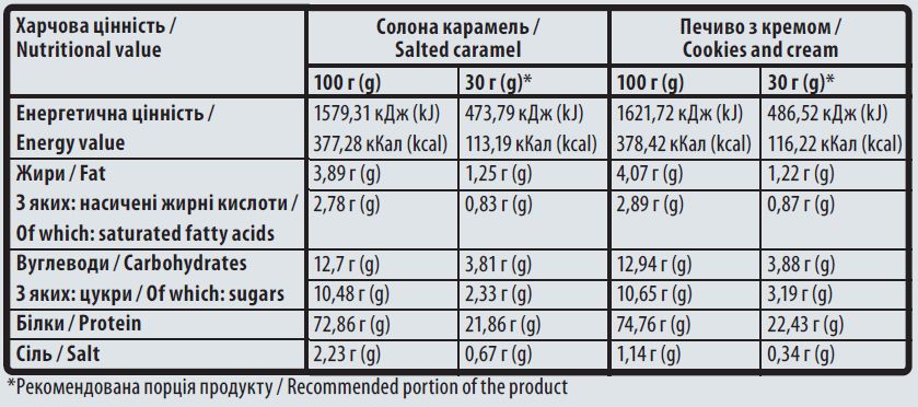 Для приготування однієї порції змішайте 1 мірну ложку (30 г) порошку з 250 мл води або молока, добре струсіть у шейкері до однорідності. Вживайте 1–2 порції на день — одну відразу після тренування, другу між прийомами їжі або вранці після сну. Продукт варто споживати відразу після приготування. Не перевищуйте рекомендовану добову порцію.