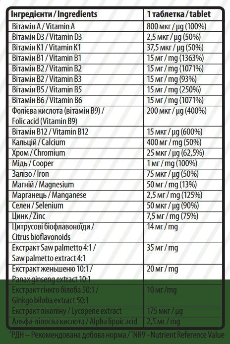 Додатково формула збагачена екстрактами женьшеню, гінкго білоба, пальми сереноа, цитрусовими біофлавоноїдами, лікопіном та альфа-ліпоєвою кислотою. Така комбінація робить продукт комплексною харчовою добавкою для щоденного використання.